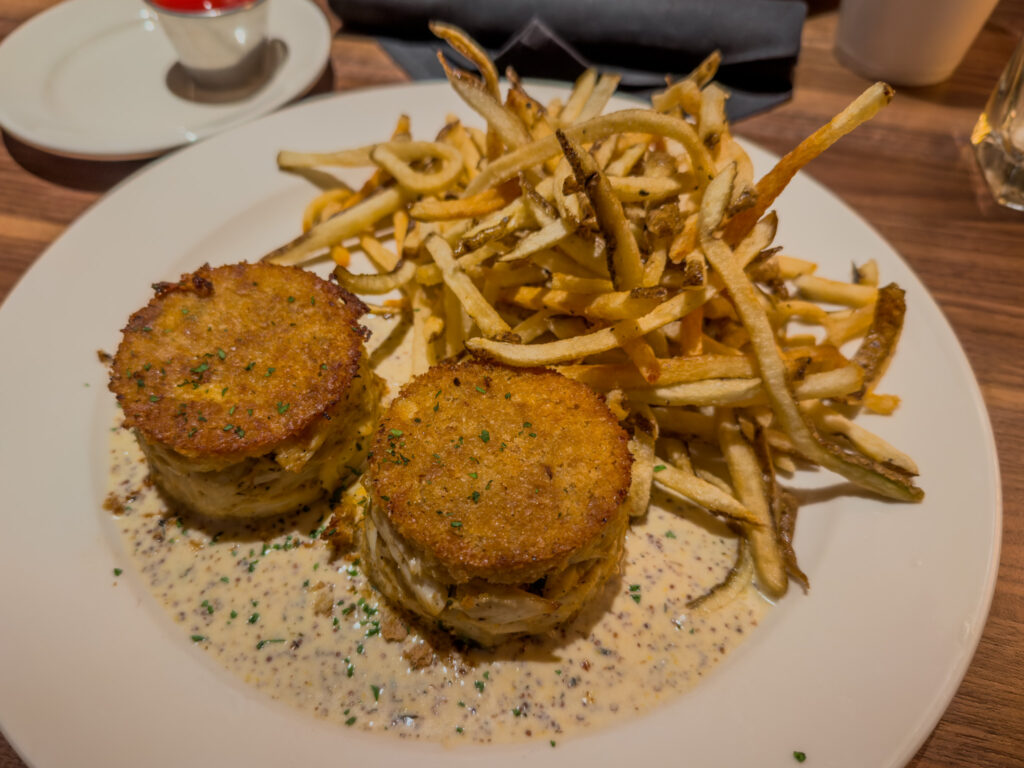 Two jumbo lump crab cakes with a whole grain mustard sauce and fresh fries. Golden at the edges, delicate within, and seasoned to lift the crab rather than hide it. This is a plate we keep coming back to.