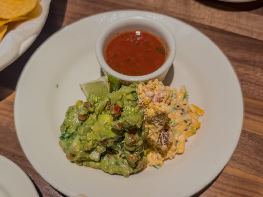 Fire-roasted pepper dip, guacamole, and salsa with warm, sturdy tortilla chips. Bright, a little smoky, and exactly what you want while you figure out the rest of the order.