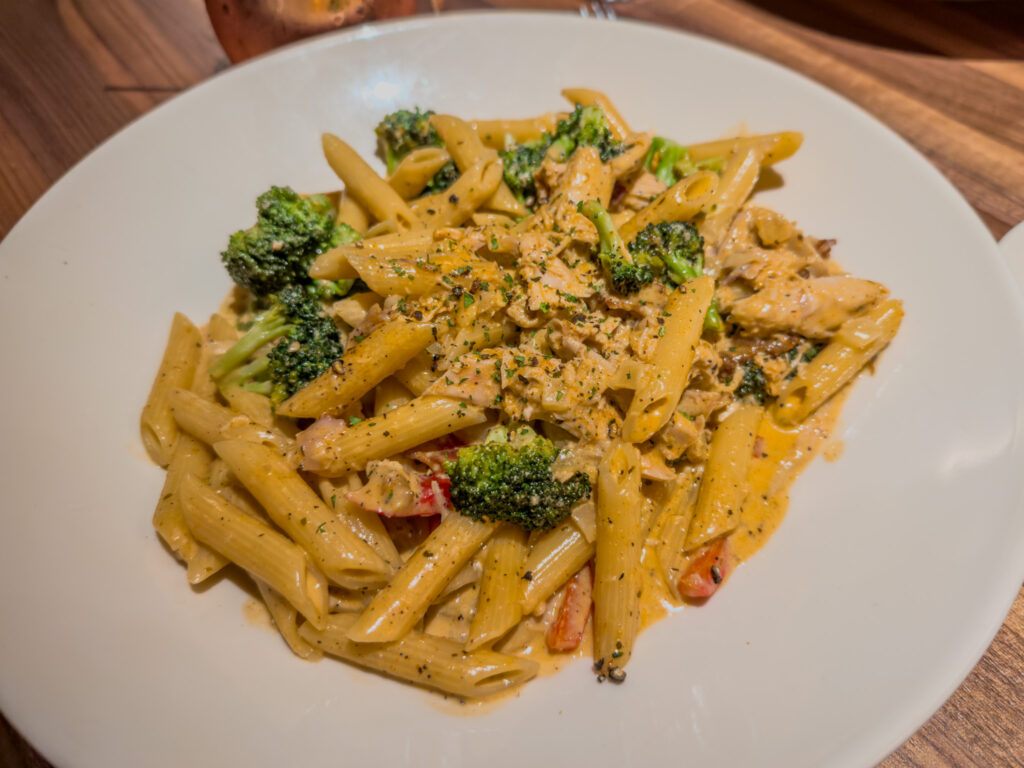 Roasted chicken, penne, red peppers, broccoli, and bacon in a creamy Cajun sauce. Smoke and spice are balanced. It reads cozy and still has personality.